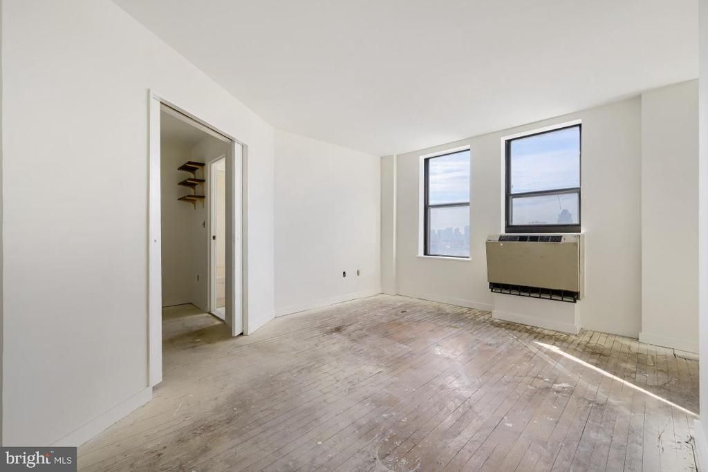 Top floor south-facing unit with incredible unobstructed city skyline views! Freshly painted, this unit is ready for your selection of flooring and offers a closed sleeping area with an attached full bath. Open kitchen with breakfast bar offers gas cooking. One of the best locations on top floor of the building, directly across from the common roof deck entrance. Great Mt. Vernon location, conveneint to downtown and all points of access. There's a 24-hour front desk to receive packages and greet your guests. Common laundry on lower level as well as convenience store on-site. Top floor, best views, great price. Come take a look at this unit today.