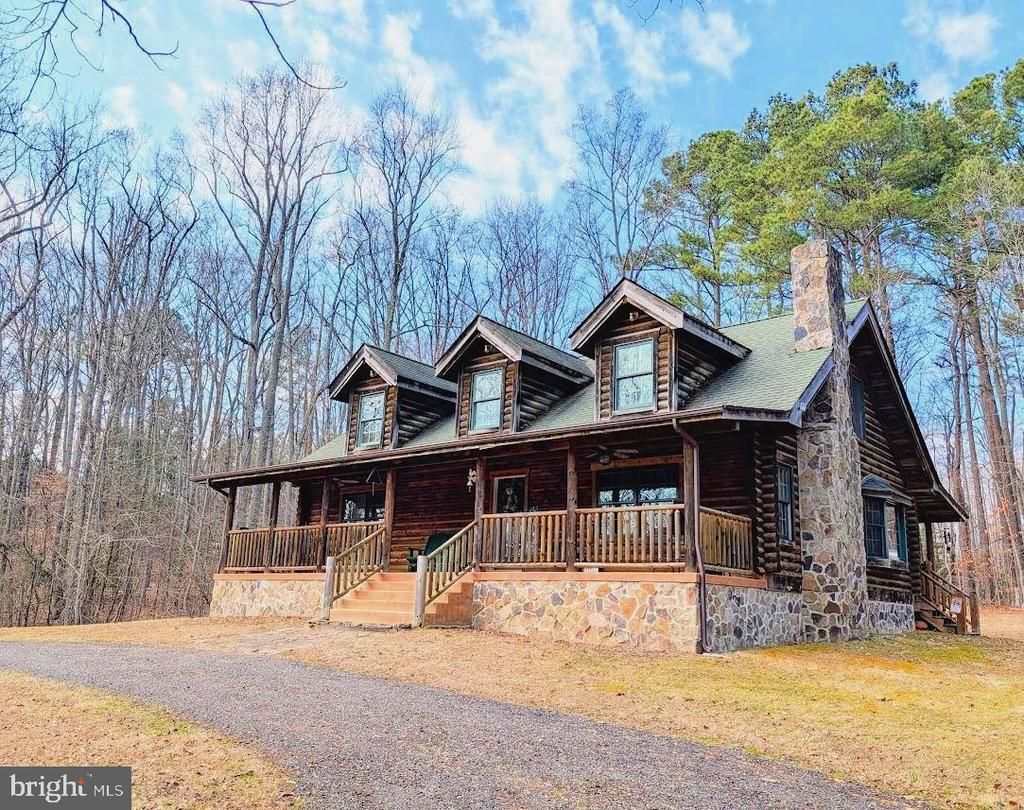Charming Heritage log home situated on 6+ private acres just minutes from Leonardtown. This unique property offers 3 bedrooms, 3 full baths, and a dedicated den/office/library with built‑in shelving. The home features custom cabinetry throughout, large windows that fill the space with natural light, and a cozy wood‑burning stone fireplace. Enjoy outdoor living on both the front and back porches, perfect for relaxing and connecting with nature. Additional highlights include an extra-large storage shed and a concrete pad that is ideal for a future workshop, hobby space, or outdoor oasis. No HOA. This is a rare opportunity to own a private retreat with convenience to town amenities.