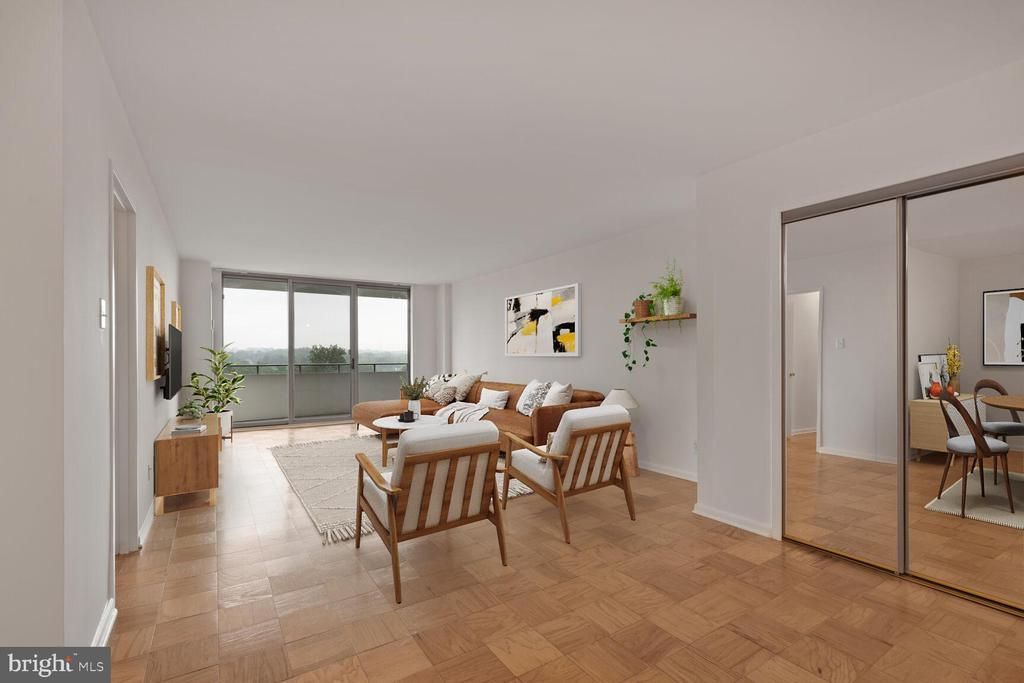 Looking for an affordable condo in Bethesda? Stop here. Welcome to this spacious and bright 1,360 sq ft, 2-bedroom, 2-bath condo at The Kenwood, conveniently located near downtown Bethesda and Westbard Square. This freshly painted unit boasts an open-concept living and dining area, perfect for modern living. Enjoy refinished parquet wood floors as you step out onto your balcony overlooking the promenade. The kitchen is thoughtfully designed with granite countertops, all white appliances and an eat-in corner. The owner's suite features sleek sliding closet doors, and an ensuite bath with NEW vanity, light fixture and mirror! Just down the hall, you'll find a shared full bathroom with NEW vanity, light fixture and mirror and an additional spacious bedroom with plenty of closet space! Separately deeded garage parking conveys with the sale. Storage space included too! Don’t miss these other benefits of living at The Kenwood; 24-hour concierge, security systems, fitness center, outdoor pool, beautifully landscaped grounds with gas grills, walking paths and benches, and a party room. Smoke Free condo building. Shared laundry room on each floor. Your condo fee includes these amenities, plus ALL UTILITIES and parking fee. Close to Whole Foods, Westbard Square, downtown Bethesda, Giant, shopping, restaurants, the Capital Crescent Trail and the DC border. The Metro Bus is right in front of the condo. Don't miss out on this opportunity!